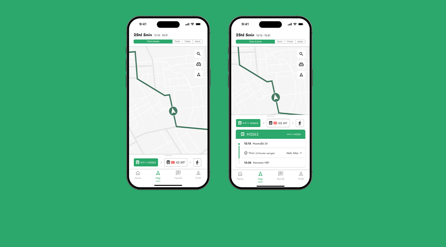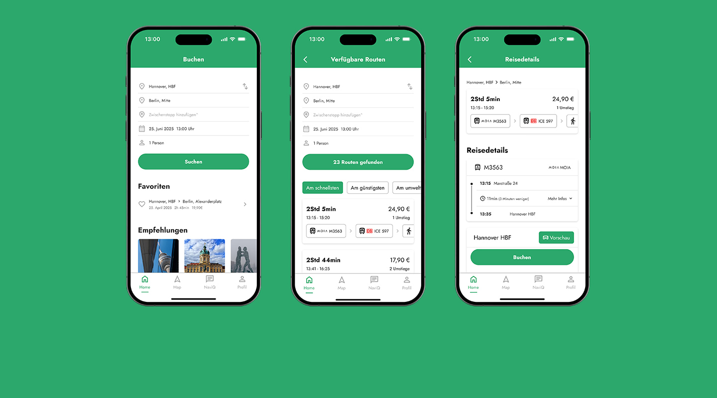 Mit Navira entwickelten wir ein App-Konzept zur Integration autonomer Fahrzeuge in den öffentlichen Nahverkehr. Ziel war es, Vertrauen und Transparenz im Umgang mit autonomen Shuttles zu schaffen und intermodale Reisen intuitiver und flexibler zu gestalten. Aufbauend auf Desk Research, Personas und User Journeys entwarfen wir Lösungen für zentrale Probleme wie unzuverlässige Anschlussverbindungen, fehlende Echtzeitinformationen oder Barrieren bei der Orientierung. Im kollaborativen Prozess entstanden Wireframes, Prototypen und ein Screendesign in Figma. Nutzerfeedback floss kontinuierlich in die Entwicklung ein und bestätigte die einfache, übersichtliche Bedienung. Das Projekt erwies sich als besonders lehrreich, um Methoden wie Collaborative UX Design praktisch anzuwenden.